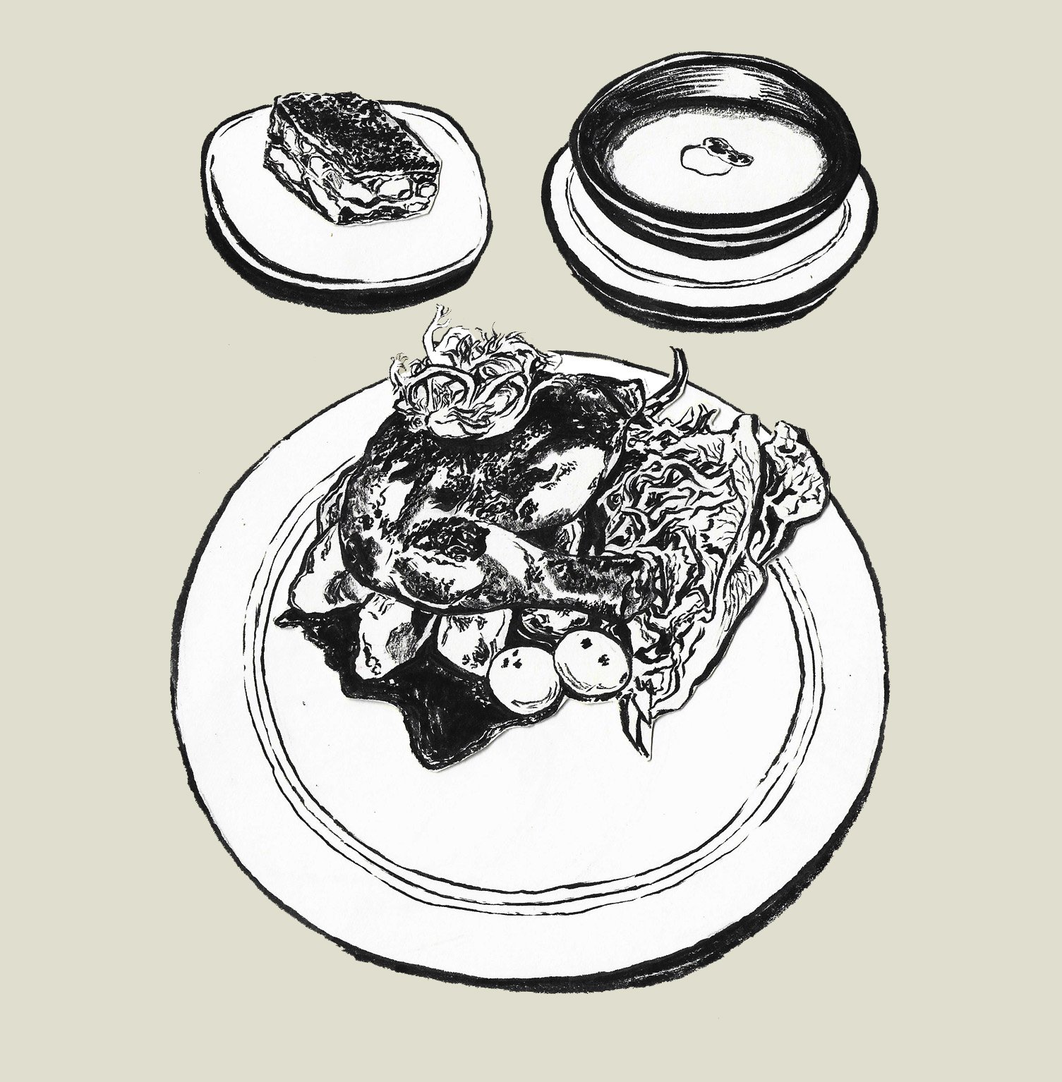 Hot menu item - roast chicken, tomato soup and tiramisu