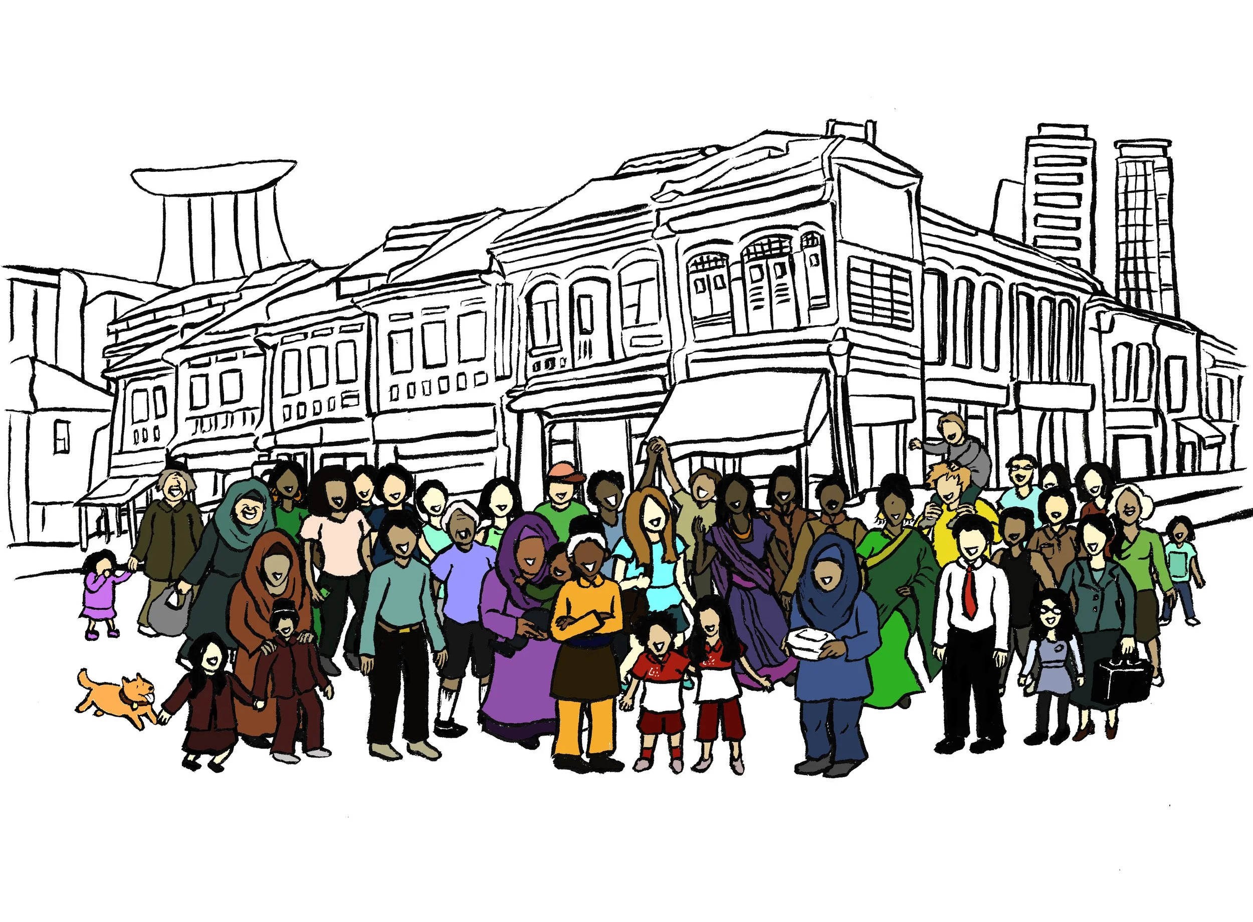 National Day post showing community, iconic Singapore skyline and heritage shophouses