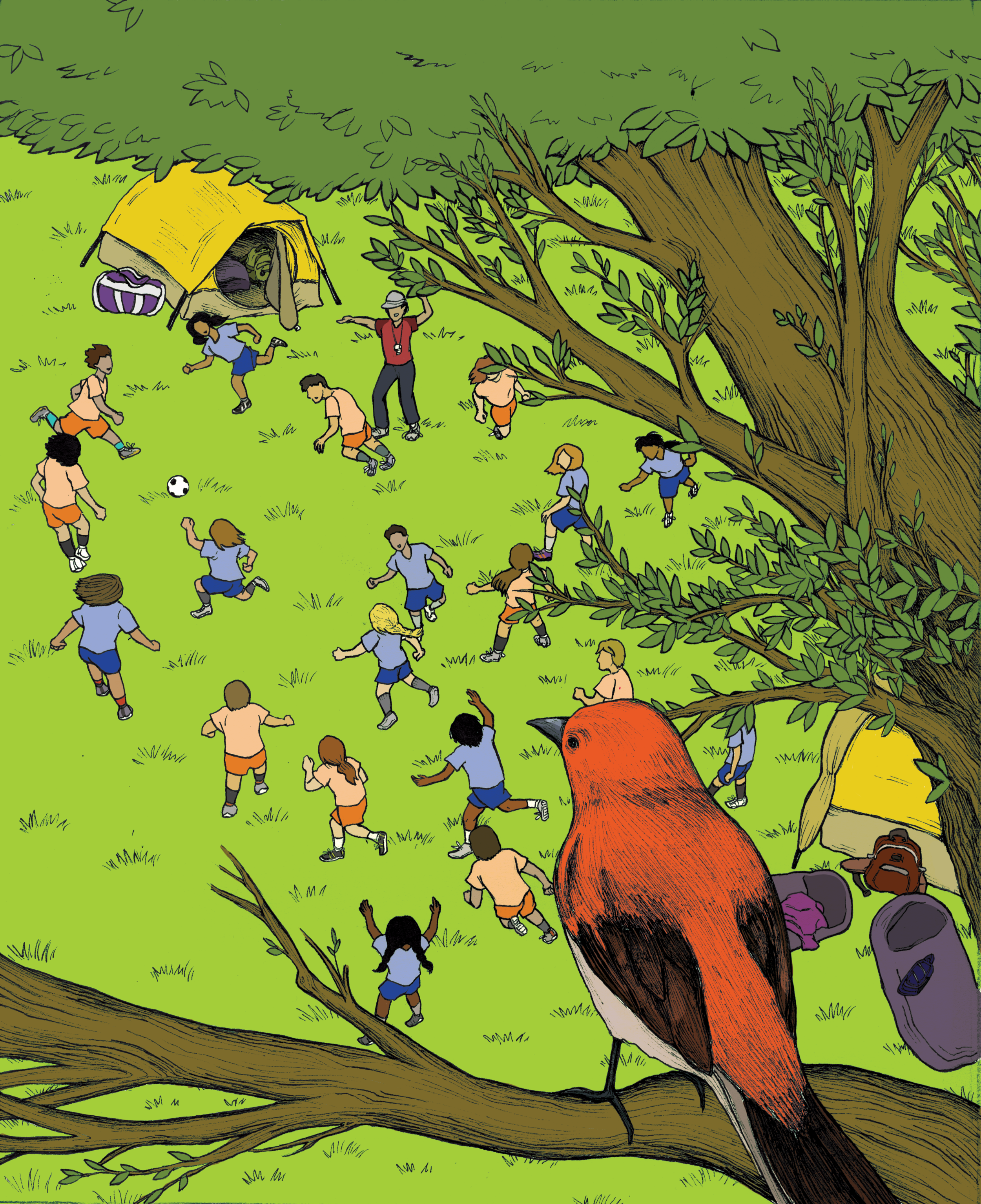 The 2019 issue of U.S.-based magazine Bay State Parent Magazine focused on Summer Camp. There are many activities to be enjoyed in summer camp; I chose football, or soccer, for my illustration. It was not chosen for the cover in the end, but it was still included in the issue as a panel image.